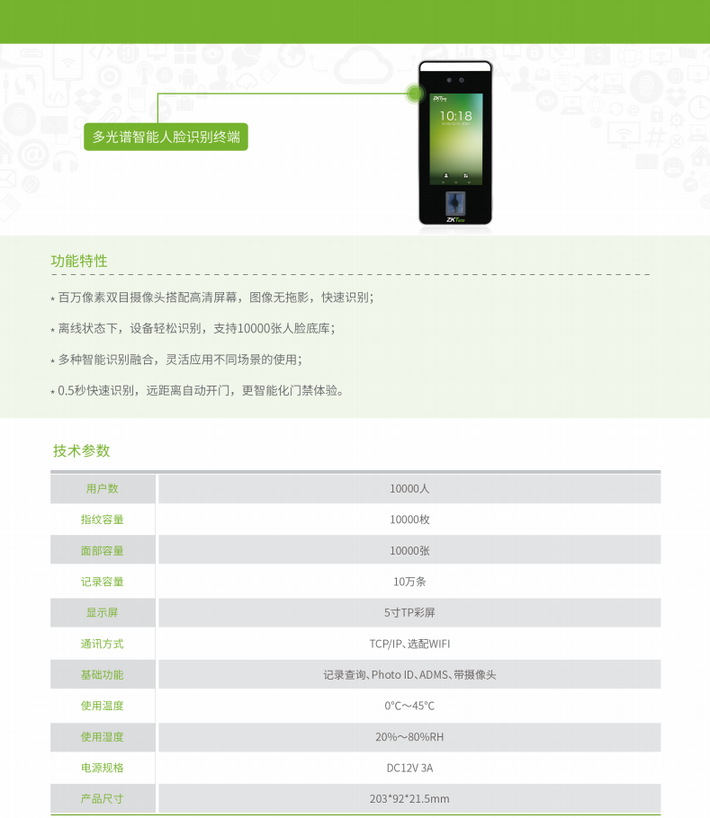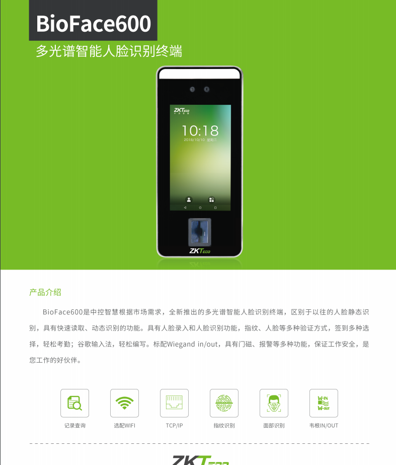BioFace系列是中控智慧根據(jù)市場需求,全新推出的多光譜智能人臉識(shí)別終端,區(qū)別于以往的人臉靜態(tài)識(shí)別,具有快速讀取、動(dòng)態(tài)識(shí)別的功能。BioFace具有人臉錄入和人臉識(shí)別功能,指紋、人臉等多種驗(yàn)證方式,簽到多種選擇,輕松考勤;谷歌輸入法,輕松編寫。標(biāo)配Wiegand in/out,具有門磁、報(bào)警等多種功能,守護(hù)您工作安全。